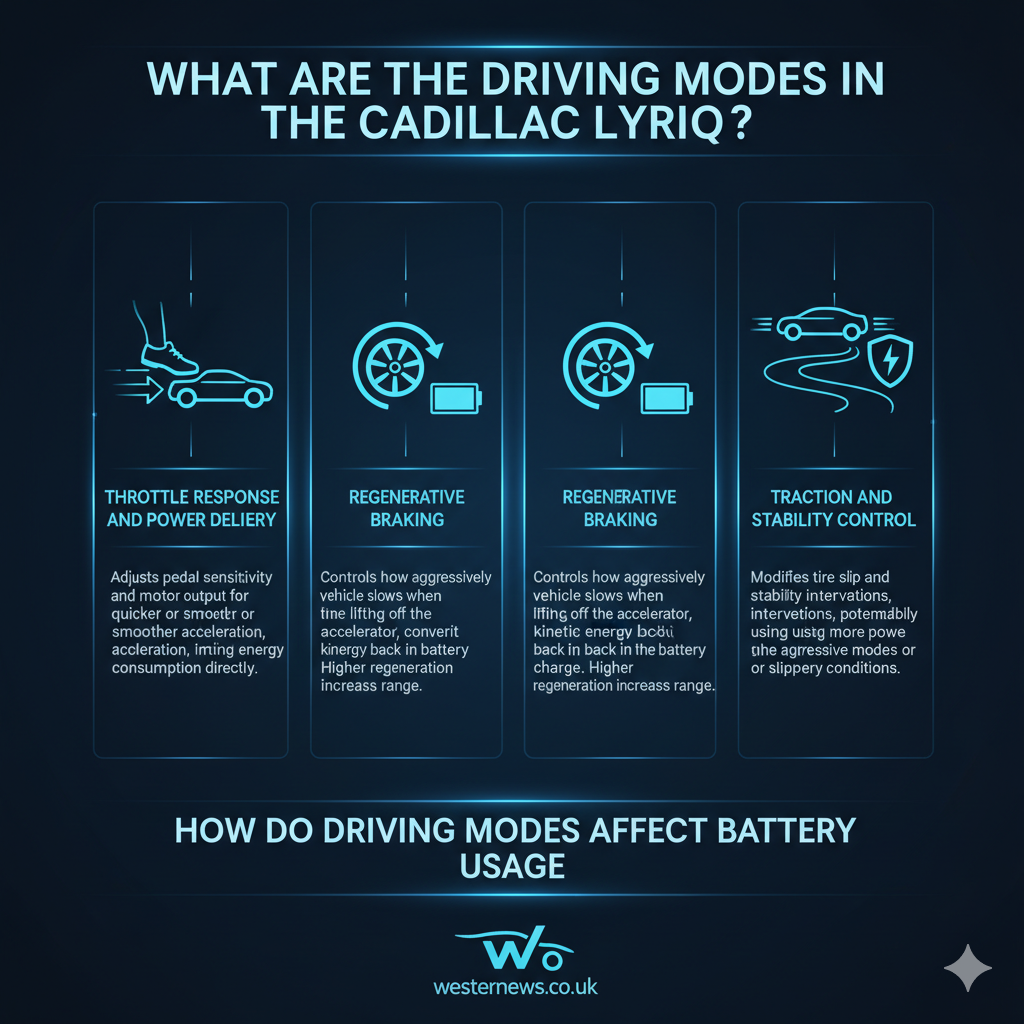 The driving modes in the Cadillac LYRIQ affect battery usage in several ways, primarily by altering the throttle response, power delivery, and regenerative braking. Each mode is optimized to provide a different driving experience, but these changes come with varying levels of battery consumption.